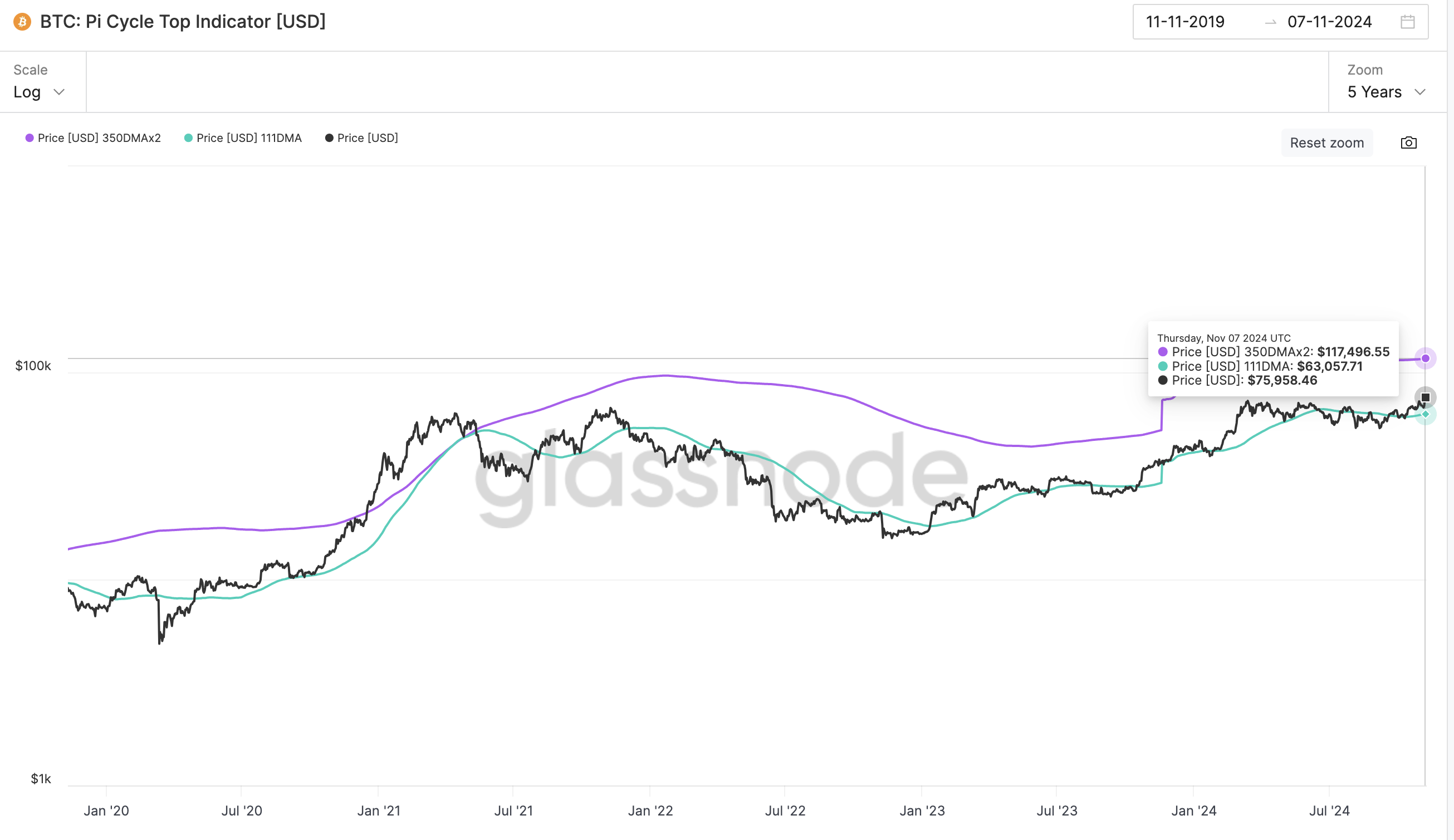 Na deze ontwikkeling zijn er voorspellingen verschenen die aangeven dat BTC $100.000 zou kunnen bereiken. Ondertussen toont de Pi Cycle Top-indicator, gebaseerd op Glassnode-gegevens, een nog optimistischer scenario en suggereert dat BTC mogelijk zou kunnen stijgen tot $117.496.