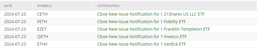 Verschillende spot Ethereum exchange-traded funds (ETF’s) zullen op 23 juli beginnen te handelen, volgens de Chicago Board Options Exchange (Cboe).