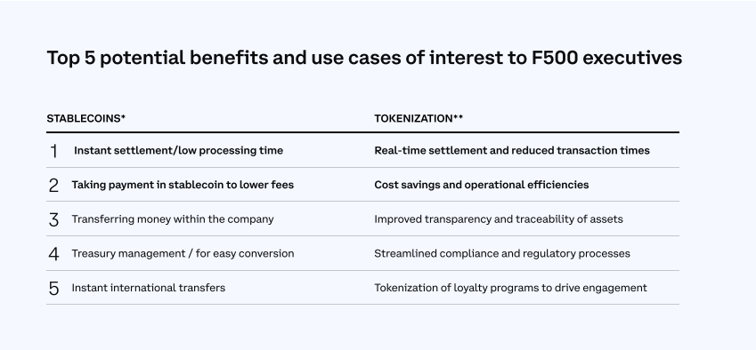 “De meeste topbedrijven hebben interesse in de potentiële voordelen van stablecoins en andere soorten tokens, vooral voor snellere, goedkopere transacties. Zeven van de tien Fortune 500-directeuren zijn geïnteresseerd in het leren over een stablecoingebruik, voornamelijk voor betalingen met onmiddellijke verwerkingstijd en lagere kosten,” aldus het rapport van Coinbase.