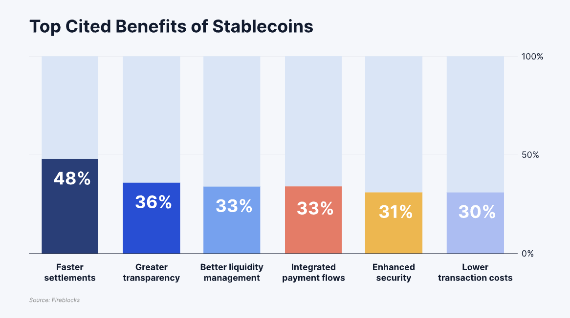 Het grootste voordeel van stablecoins is de snelheid van directe afwikkeling, wat door 48% van de leidinggevenden wordt gewaardeerd, veel meer dan kostenbesparingen. Internationale B2B-betalingen zijn de belangrijkste toepassing, vooral in Latijns-Amerika, waar 71% van de organisaties het gebruik prioriteit geeft.