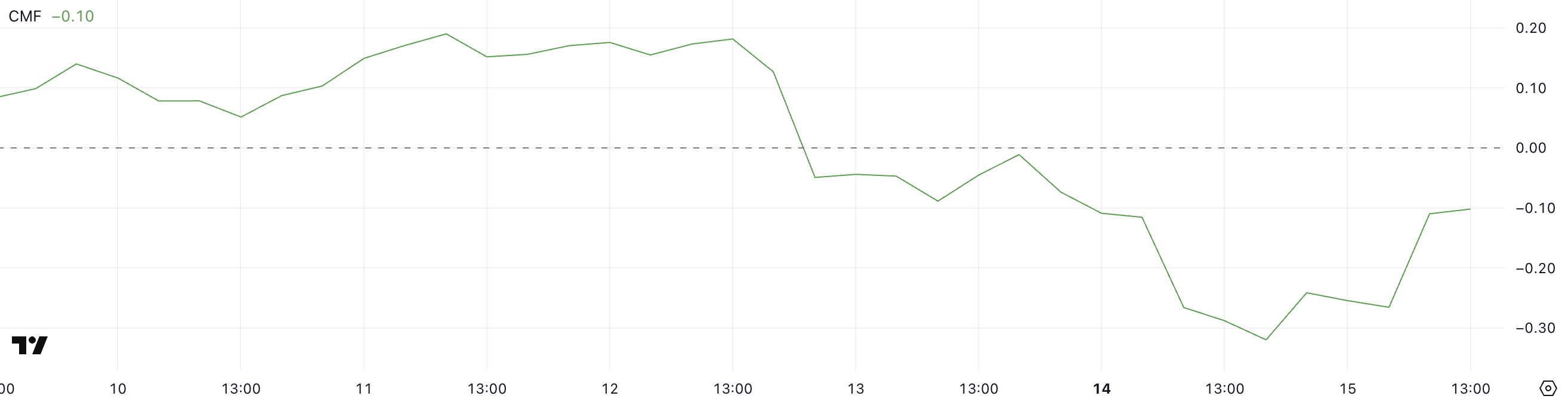 Hoewel nog steeds in negatief gebied, suggereert de stijging naar de neutrale lijn dat het bearish momentum aan het verzwakken is. Een CMF-waarde van -0,10 wijst op gematigde uitstroom, maar de opwaartse verschuiving kan wijzen op groeiende interesse van kopers.
