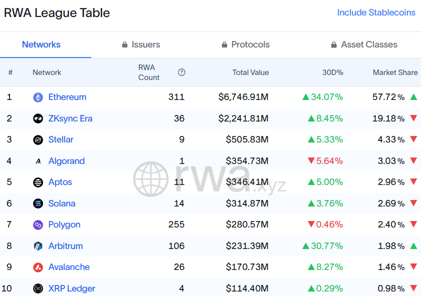 Momenteel staat Stellar als het derde grootste protocol in RWA-marktkapitalisatie, alleen achter Ethereum en ZKsync Era. Opmerkelijke spelers in Stellar’s RWA-ecosysteem zijn onder andere het Franklin Templeton OnChain US Government Money Fund (ter waarde van $497 miljoen) en Circle’s USDC stablecoin, die $345 miljoen op het Stellar-netwerk houdt.
