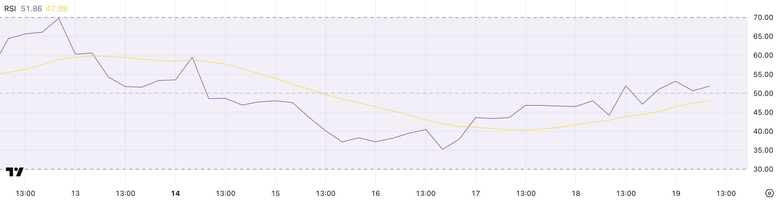 De +DI staat op 15,83 terwijl de -DI op 13,15 staat, wat betekent dat kopers een klein voordeel hebben—maar de lage ADX suggereert dat dit voordeel niet sterk is. Er is momenteel geen duidelijke trend die de markt domineert.