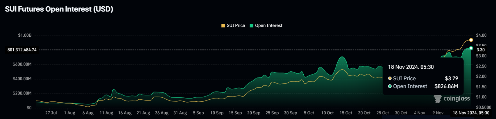 Analist Michael Van de Poppe heeft onlangs SUI bestempeld als “het beste om te kopen” tijdens de correctiefase van Bitcoin. De populariteit van de altcoin onder handelaren is duidelijk, met SUI die trending is op grote platforms. De open interest in SUI-futures heeft ook een all-time high van $826 miljoen bereikt, wat wijst op een verhoogde vraag en vertrouwen van investeerders.