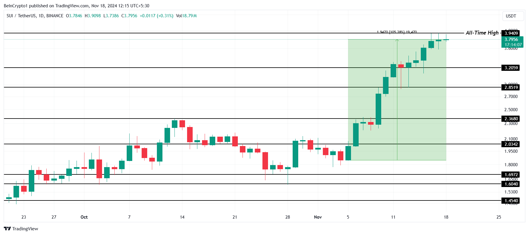 SUI wordt momenteel verhandeld op $3,79, net onder zijn all-time high van $3,94, behaald afgelopen weekend. De indrukwekkende rally van 105% van de altcoin heeft zijn positie als een van de best presterende cryptocurrencies deze maand verstevigd.