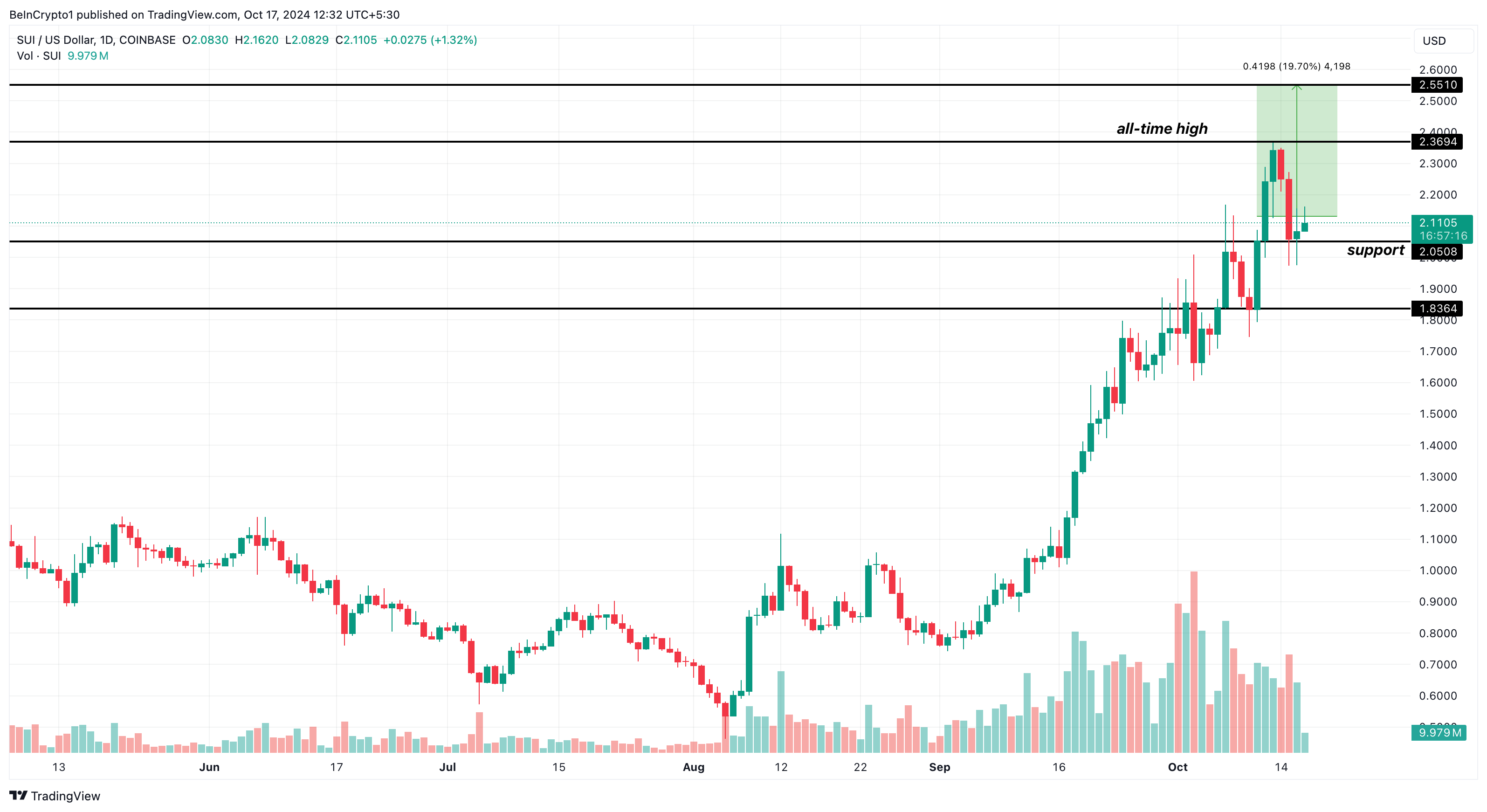 De SUI koers staat momenteel op $2,12, een daling van 10,63% ten opzichte van de all-time high van $2,36 op 14 oktober. De daling kan worden toegeschreven aan geruchten over een insider-verkoop van SUI ter waarde van $400 miljoen, een bewering die de Sui Foundation heeft ontkend.