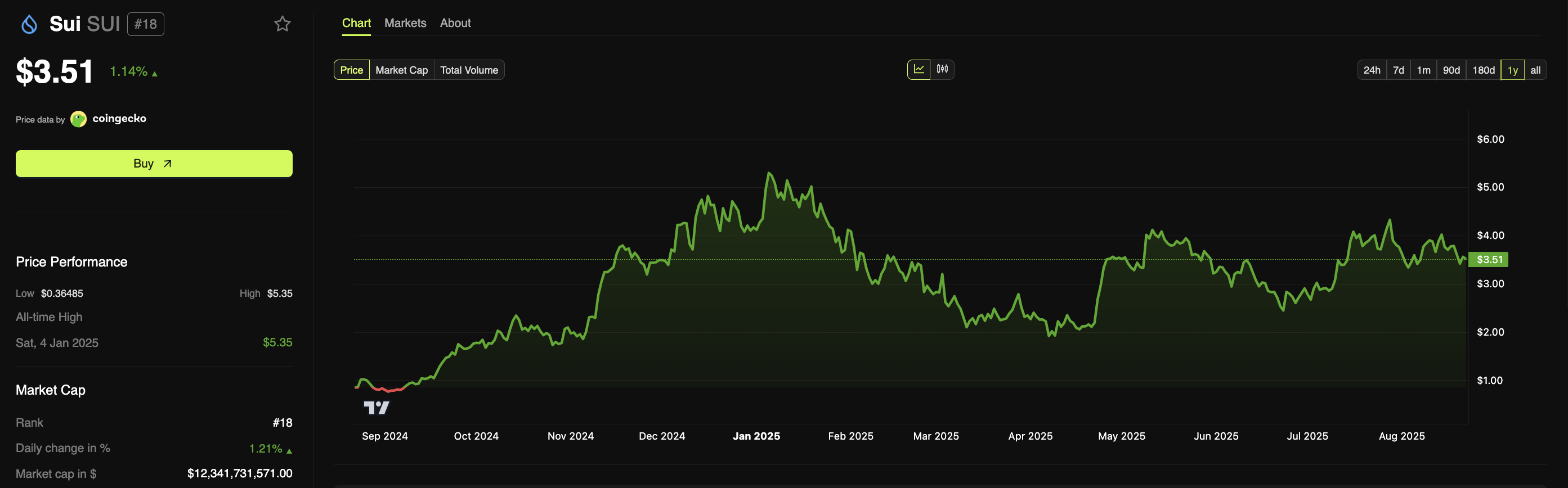 De circulerende marktkapitalisatie van SUI steeg met 31,3% naar $12,34 miljard, wat de bredere cryptomarkt met 23,5% in groei overtrof. Echter, blijft de SUI koers meer dan 34% onder zijn all-time high. De koers stond op het moment van schrijven op $3,51, een stijging van 1% in de afgelopen 24 uur.