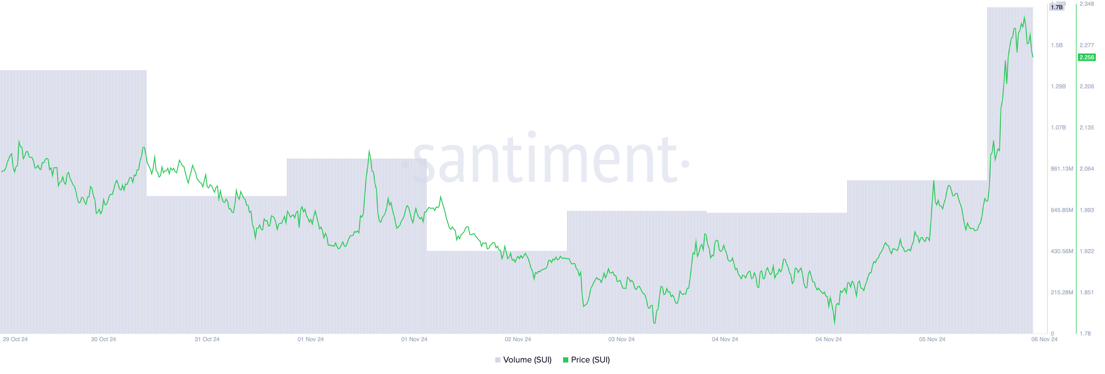 Een overeenkomstige piek in handelsvolume heeft de dubbelcijferige koersstijging van SUI vergezeld. Met een totaal van $2 miljard op dit moment, is het handelsvolume van de token met 184% gestegen in de afgelopen 24 uur.