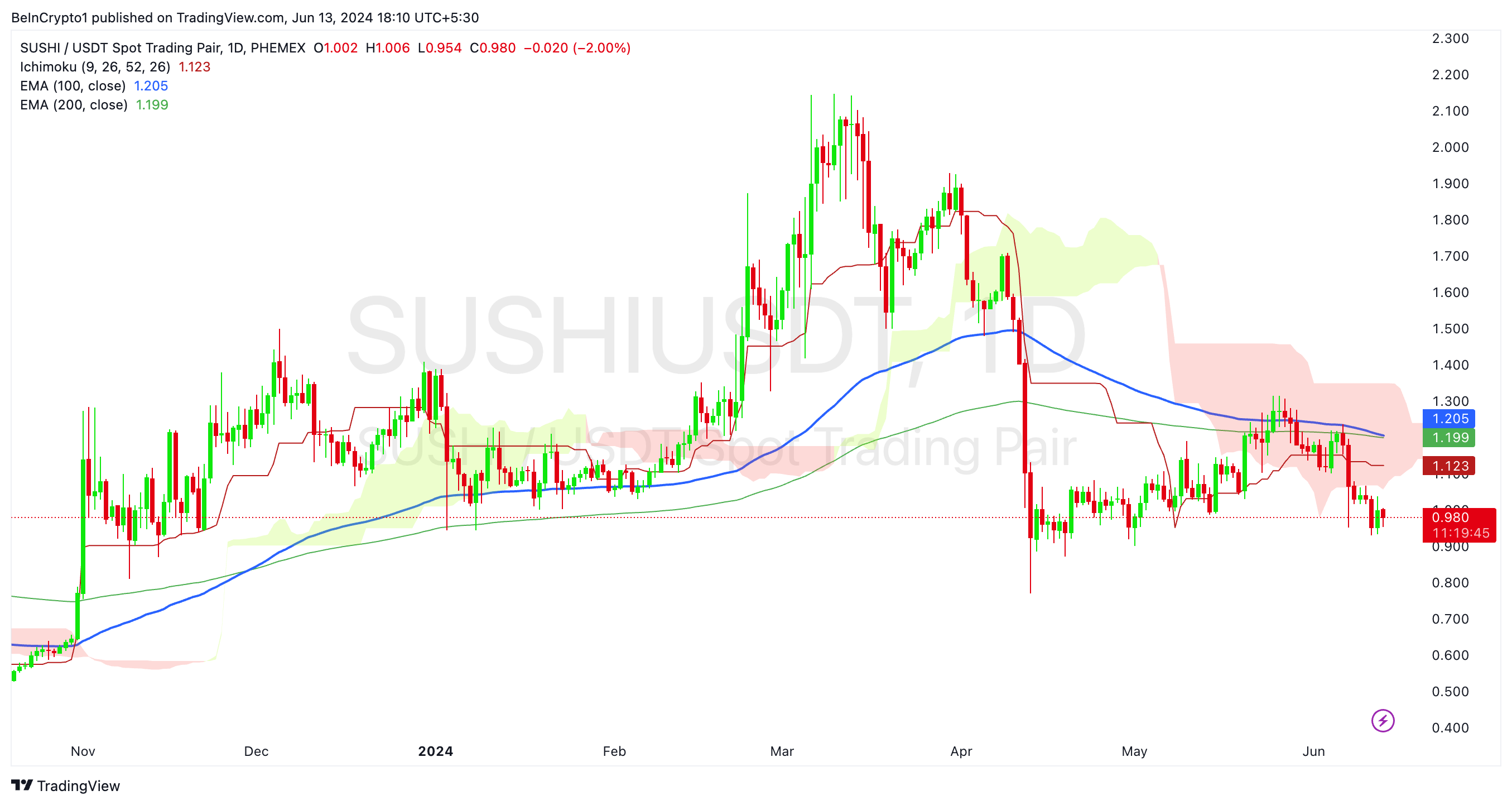 De prijs van SUSHI vertoont duidelijke bearish tekenen op de dagelijkse grafiek. Het heeft herhaaldelijk zowel de 200 EMA (groen) als de 100 EMA (blauw) getest terwijl het zich binnen de Ichimoku Cloud bewoog.