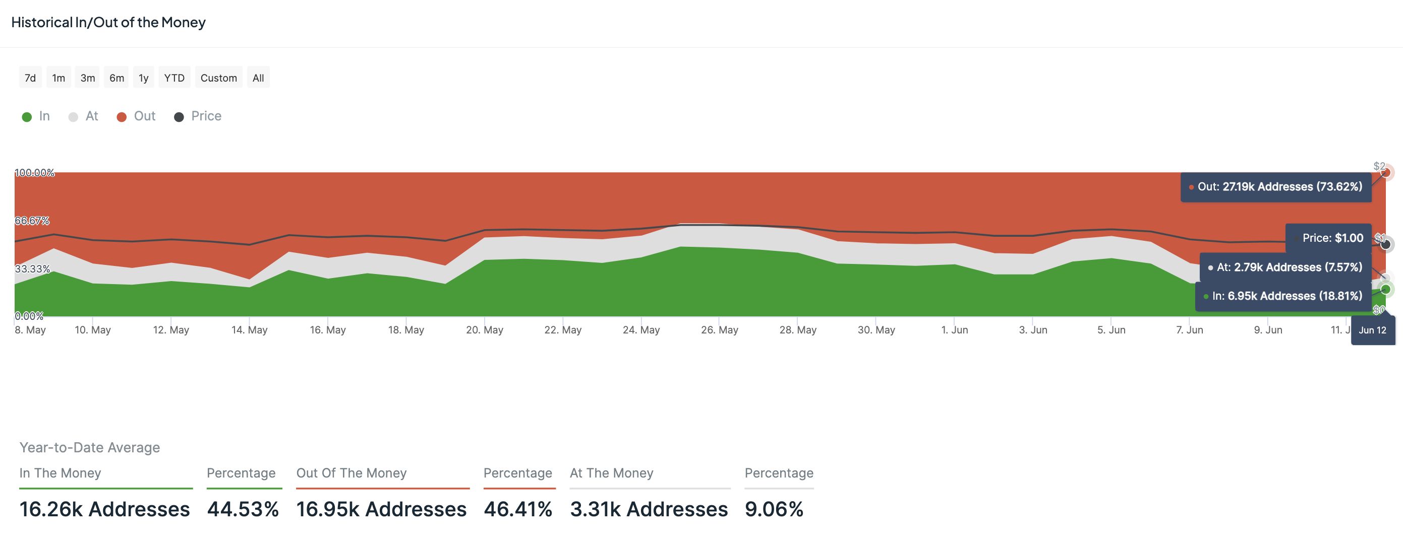 Sponsored SponsoredTussen 1 juni en 12 juni waren er opmerkelijke verschuivingen in de adressen met SUSHI op het Arbitrum-netwerk. Het aantal adressen met verlies, of Out of the Money, steeg met 23.804, een stijging van 47,78%. Aan de andere kant daalden de At the Money-adressen, die in break-evenposities, met 7.081, een daling van 48,34%. In de Money-adressen, of die in de winst, daalden met 16.724, een daling van 47,06%.