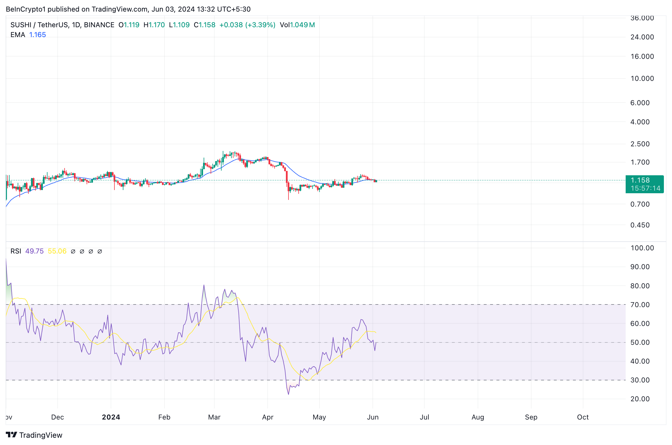 Sponsored SponsoredDe afname van de koopdruk bij SUSHI wordt bevestigd door de Relative Strength Index (RSI), die 49,65 staat, onder het neutrale 50-punt. Bij deze waarde suggereert deze momentum indicator dat SUSHI-traders liever hun huidige holdings verkopen dan nieuwe tokens te kopen.