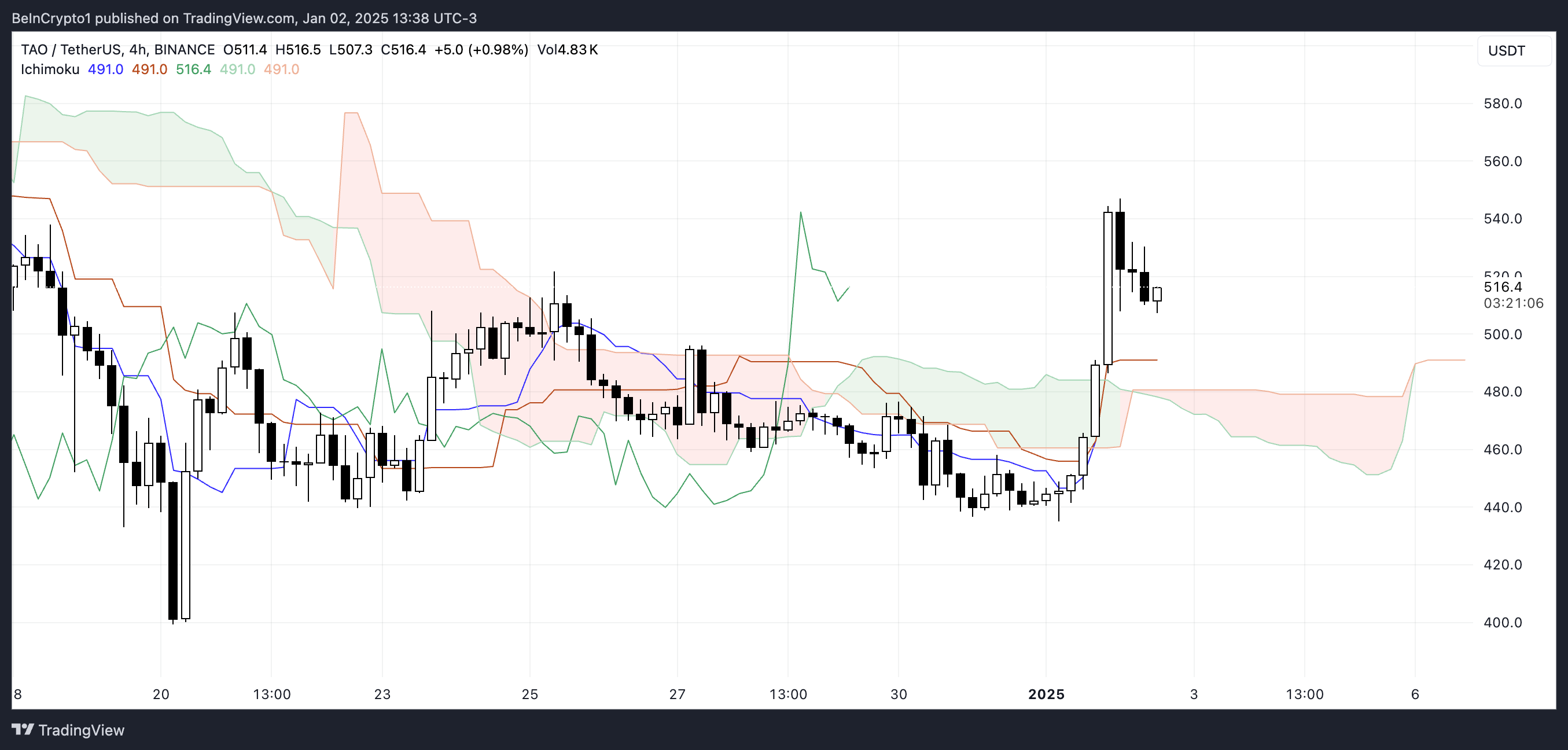 De Ichimoku Cloud-grafiek voor TAO toont een sterke bullish setup, aangezien de koers overtuigend boven de rode cloud is uitgebroken. Deze uitbraak duidt op een verschuiving in marktsentiment, waarbij kopers de controle overnemen en de koers hoger drijven.