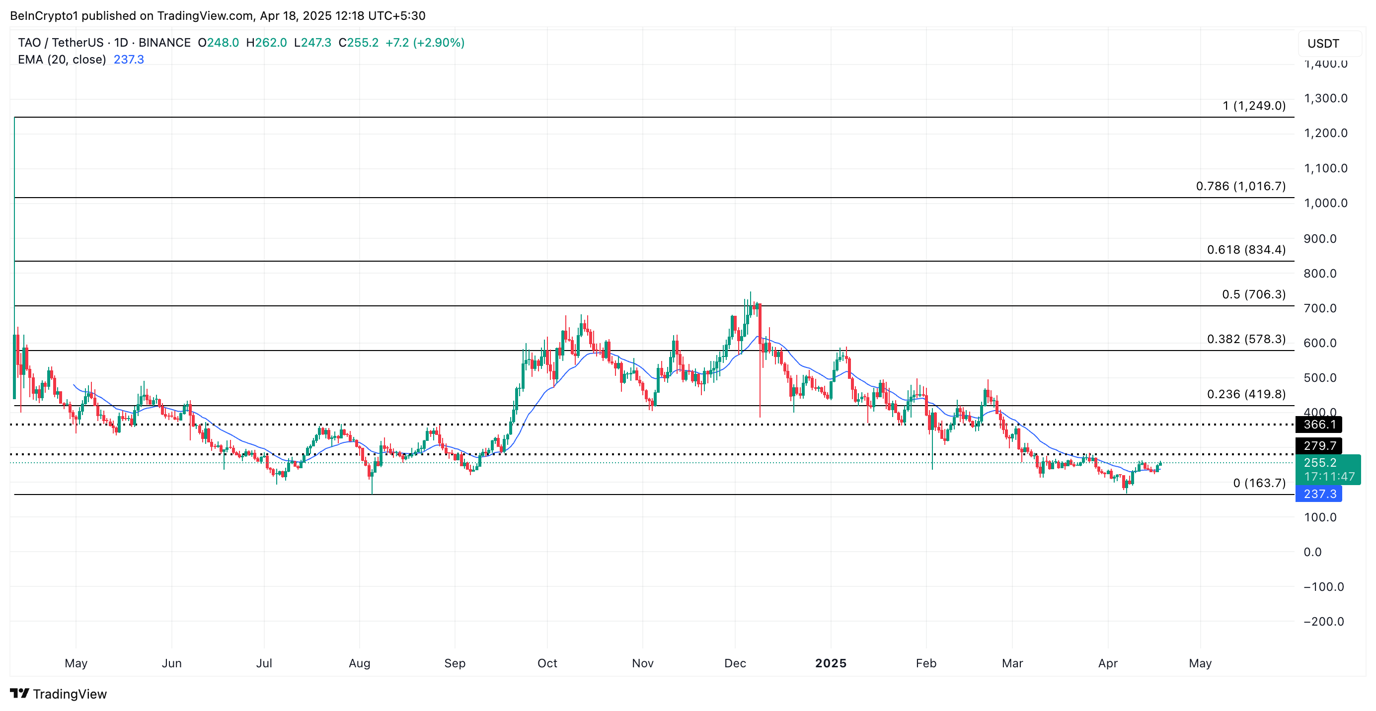 De TAO koers is boven zijn 20-daagse Exponential Moving Average (EMA) gestegen, een indicator die een sterke bullish trend in zijn spotmarkt suggereert.