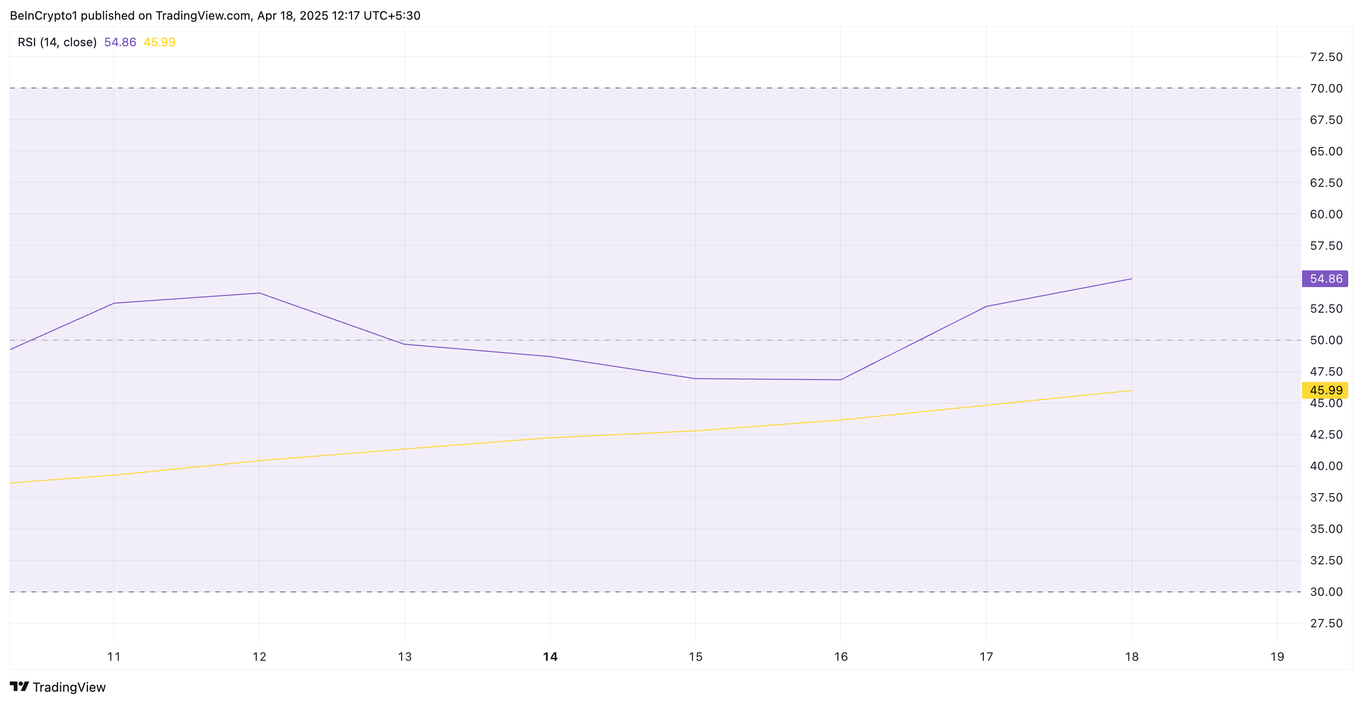 Deze indicator varieert tussen 0 en 100. Waarden boven 70 suggereren dat de asset overbought is en een koersdaling te wachten staat, terwijl waarden onder 30 aangeven dat de asset oversold is en mogelijk een herstel zal zien.