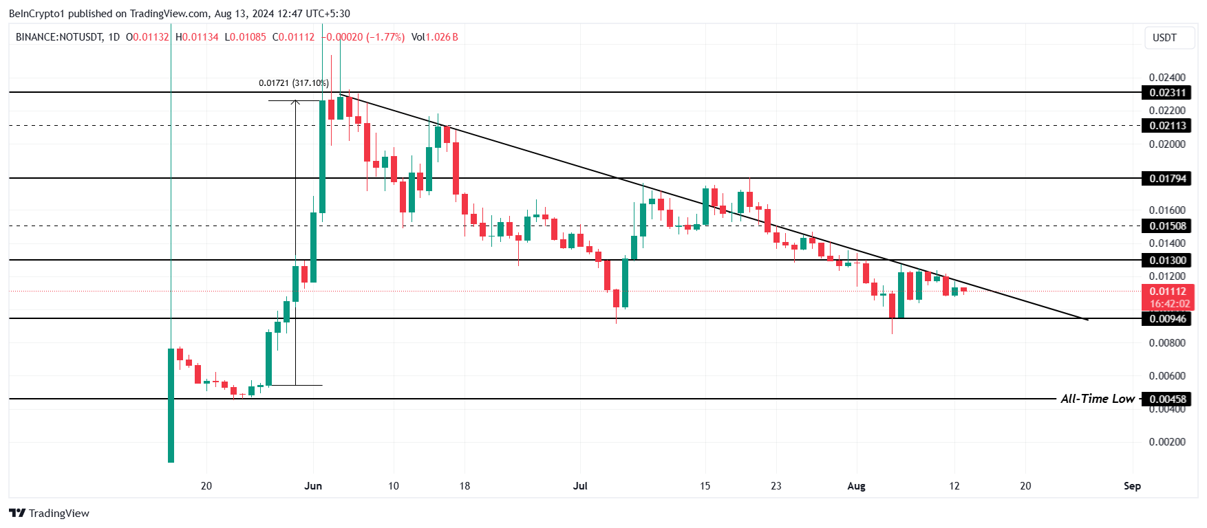 Telegram coin Notcoin (NOT) heeft een goede kans om een opwaartse trend te hervatten na meer dan twee maanden onderdrukt te zijn geweest.