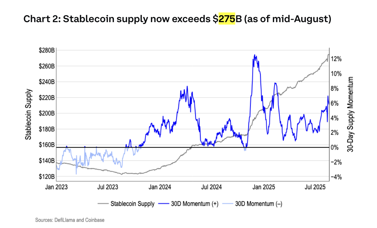 De stablecoin-sector beleeft in 2025 een explosieve groeifase, aangejaagd door sterke institutionele adoptie en meer regelgevende duidelijkheid wereldwijd. Volgens het augustusrapport van Coinbase is de totale marktkapitalisatie van stablecoins inmiddels gestegen tot ruim $275 miljard. Analisten verwachten dat de markt tegen 2028 zelfs kan doorgroeien naar $1 biljoen.