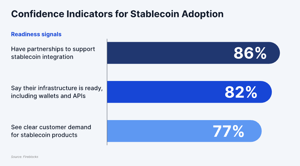 De groei wordt vooral gedreven door het gebruik van stablecoins in grensoverschrijdende betalingen, die inmiddels goed zijn voor meer dan 43% van de B2B-transacties in Zuidoost-Azië. 2025 markeert een keerpunt waarin instituties stablecoins actief integreren: uit een enquête van Fireblocks blijkt dat 90% van de ondervraagde instellingen stappen zet om stablecoins te gebruiken voor treasurybeheer en internationale afwikkeling.