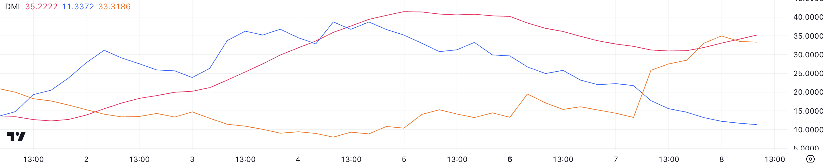 De Average Directional Index (ADX) voor TIA staat momenteel op 35,2, gestegen van 31,2 slechts een dag geleden, wat wijst op een versterkende trend. De ADX meet de sterkte van een trend, of deze nu bullish of bearish is, op een schaal van 0 tot 100, waarbij waarden boven 25 een sterke trend aangeven en onder 20 zwakke of afwezige momentum weerspiegelen.
