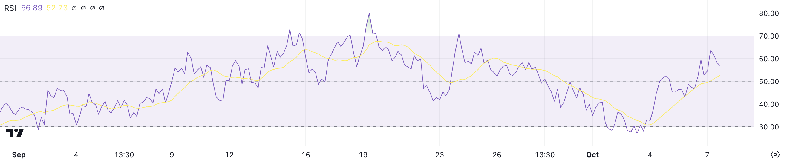 TIA’s Relative Strength Index (RSI) is momenteel 56,89, gestegen van ongeveer 31 slechts drie dagen geleden. Deze significante toename is belangrijk omdat het een verschuiving in momentum suggereert. Dat geeft aan dat TIA koers aan kracht wint na een periode van relatieve zwakte.