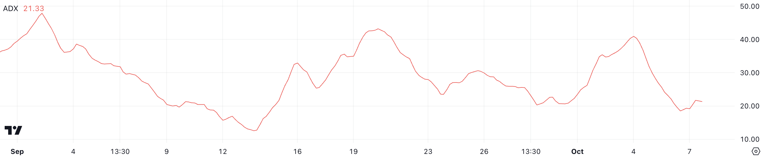 Hoewel de TIA koers de afgelopen vier dagen met 21% is gestegen, is het belangrijk om de huidige trend te controleren. De Average Directional Index (ADX) voor TIA is momenteel 21,33, gedaald van 40,81 slechts drie dagen geleden. Deze daling suggereert dat de kracht van de huidige trend afneemt, wat aangeeft dat het opwaartse momentum mogelijk niet zo sterk is als het lijkt.