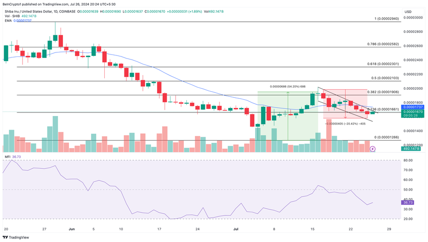 Momenteel handelt SHIB binnen een dalend kanaal tussen $0,000015 en $0,000019. De token handelt echter onder de 20 EMA (blauw), die de kortetermijntrend meet.