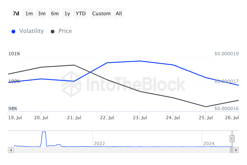 Als de volatiliteit high wordt, kan de koersactie echter veranderen. De token zou kunnen stijgen naar $0,000021 als de high volatiliteit gepaard gaat met een verhoogde koopdruk. Als marktdeelnemers besluiten om te verkopen te midden van high volatiliteit, zou de waarde richting $0,000012 kunnen gaan.