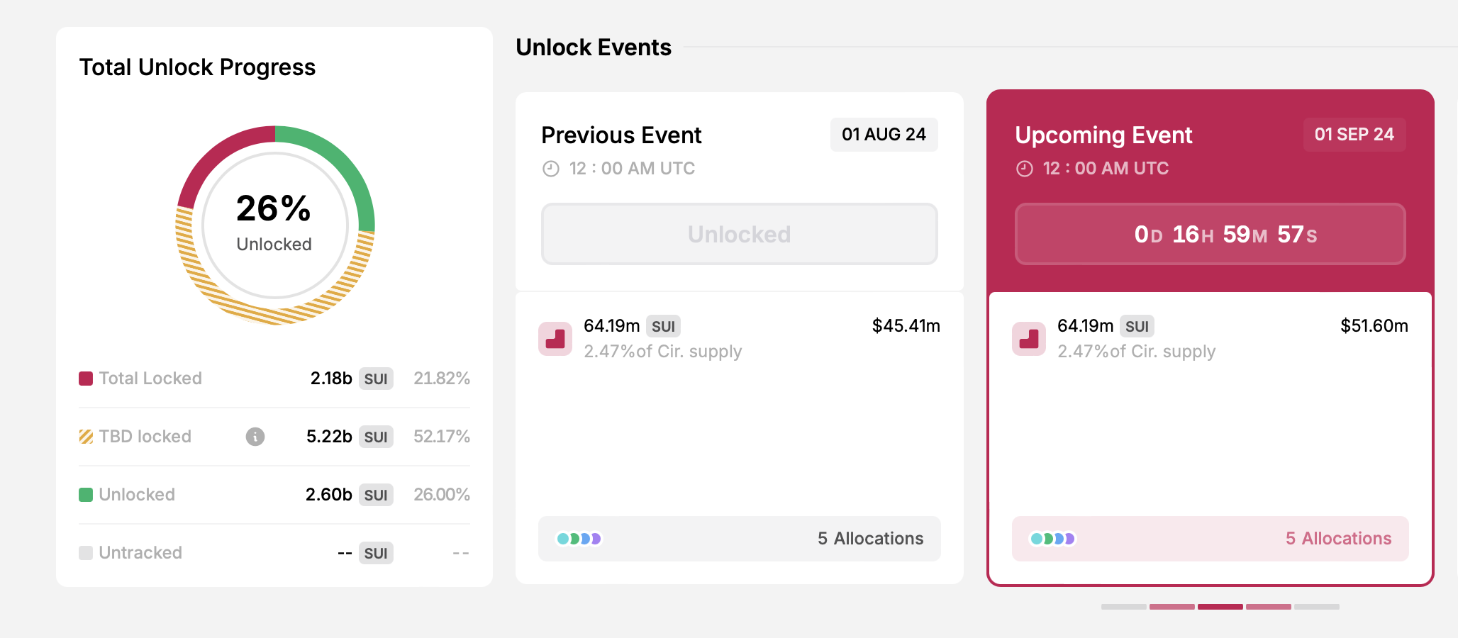 Op 1 september zal Sui 64,19 miljoen tokens vrijgeven. Deze tokens, ter waarde van ongeveer $51,6 miljoen, vertegenwoordigen 2,47% van zijn circulerende voorraad. De verdeling van deze tokens zal als volgt zijn: