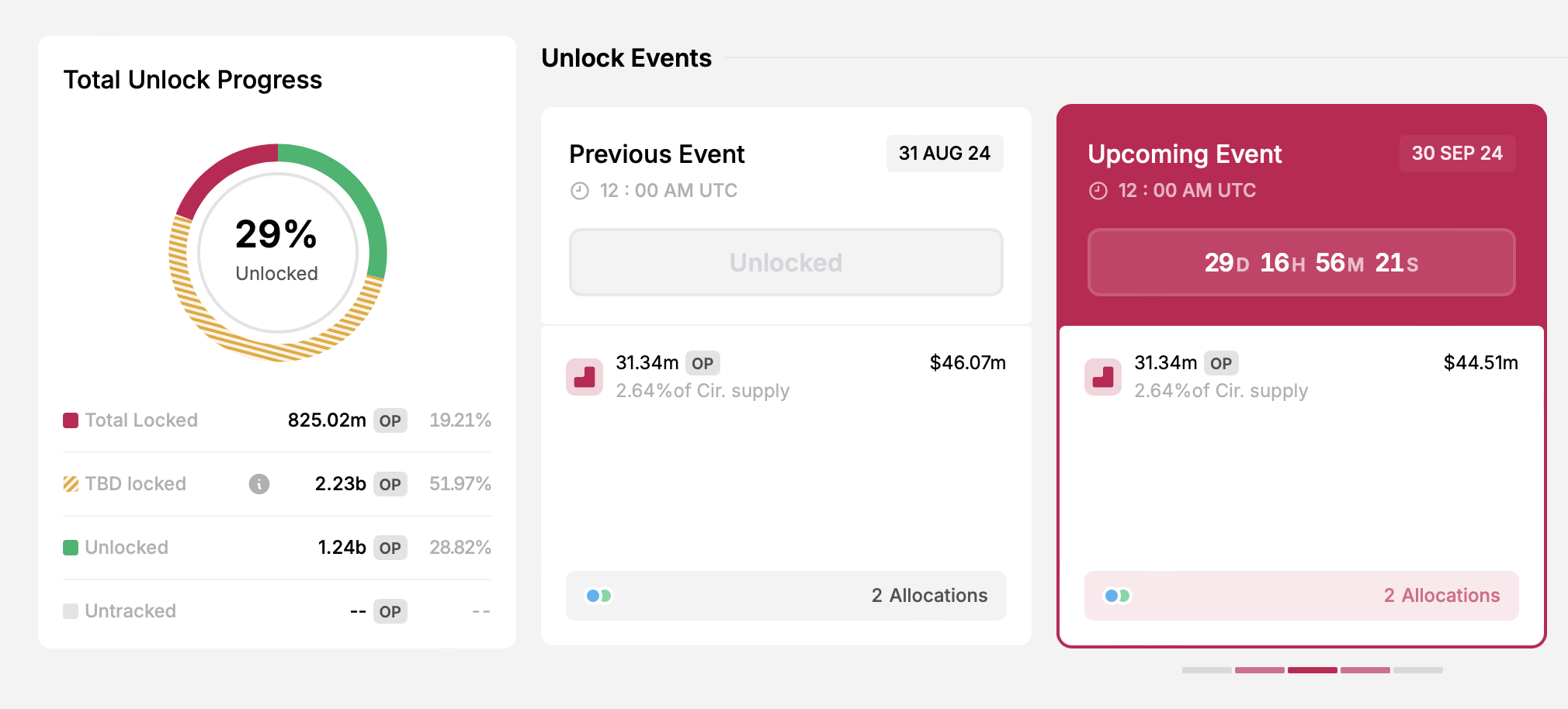 Tenslotte zal Optimism op 30 september 31,34 miljoen OP-tokens vrijgeven, met een waarde van $44,51 miljoen. Deze tokens zullen worden toegewezen aan kernbijdragers en investeerders, ter ondersteuning van de langetermijnduurzaamheid van het project. De verdeling van deze token unlock zal als volgt zijn: