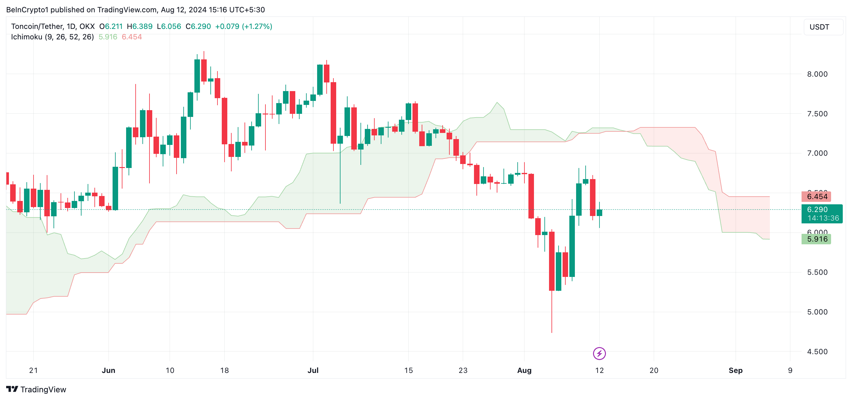 De short weddenschappen geplaatst tegen de koers van TON kunnen positieve resultaten opleveren aangezien de bearish kijk ook aanhoudt op zijn spotmarkt. Op dit moment ligt de koers van TON onder zijn Ichimoku Cloud