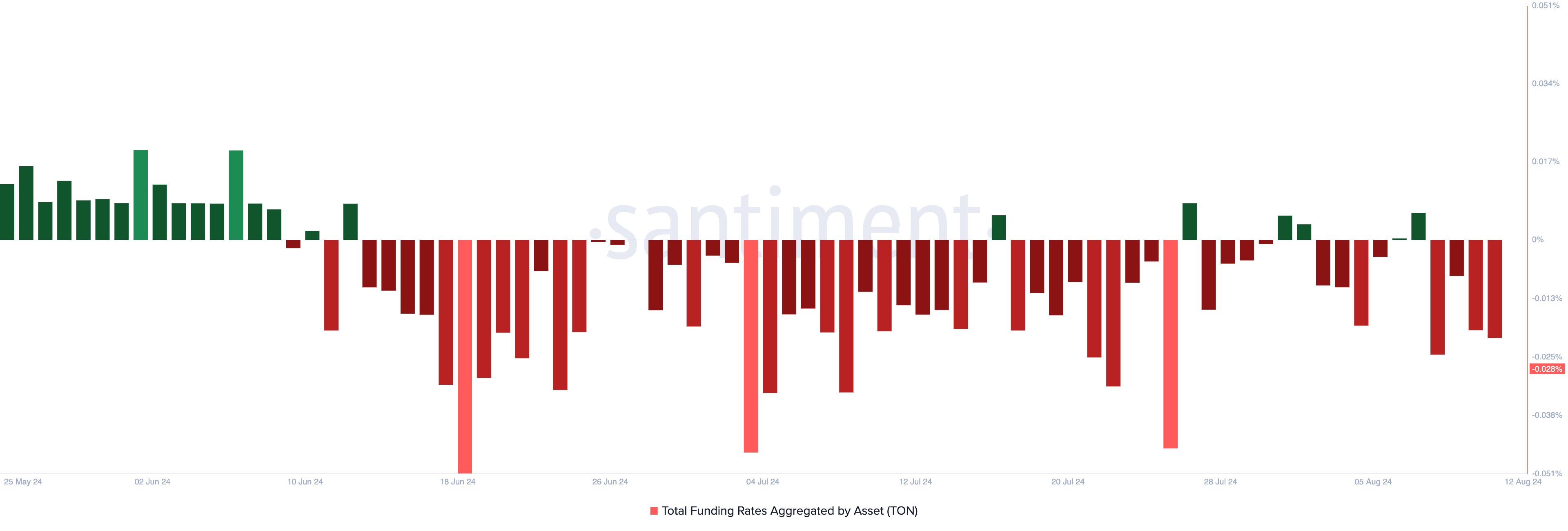 Op het moment van schrijven is de funding rate van TON -0,028%. Volgens Santiment is de funding rate van de coin sinds 13 juni overwegend negatief