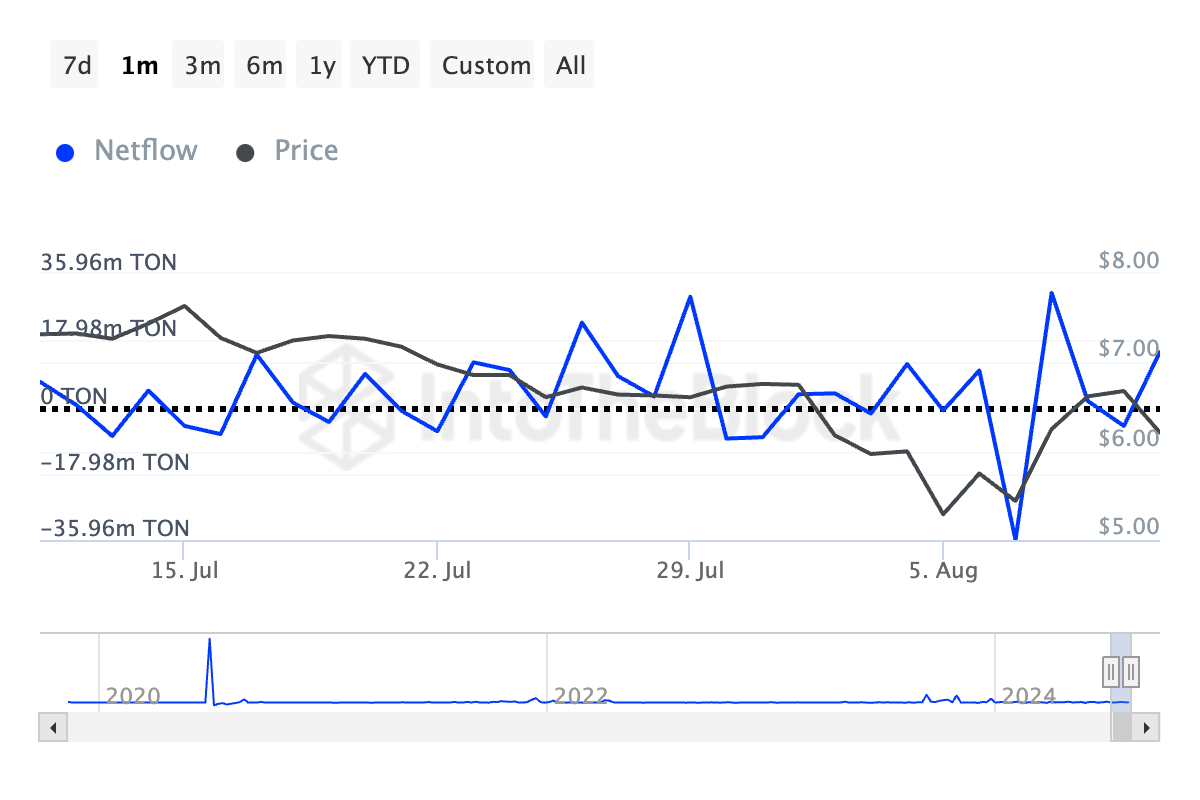 De daling van de TON whale holdings weerspiegelt deze bearish kijk. Volgens gegevens van IntoTheBlock is de netflow van grote houders van TON met meer dan 250% gedaald in de laatste maand