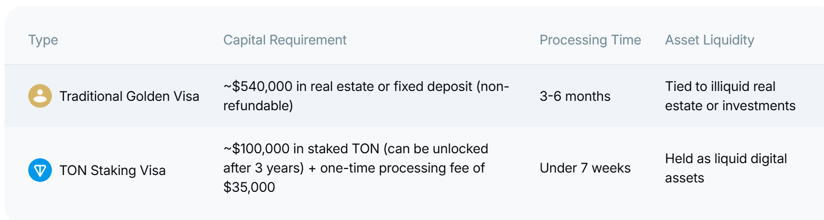 In tegenstelling tot standaard Golden Visa’s, die tot zes maanden verwerkingstijd vergen, biedt de TON-gebaseerde optie een veel snellere afhandeling: aanvragers kunnen hun visum binnen zeven weken ontvangen. Bovendien behouden ze de liquiditeit van hun staked assets, waardoor ze geen last hebben van de illiquiditeitsrisico’s die vaak gepaard gaan met traditionele investeringsvisa.