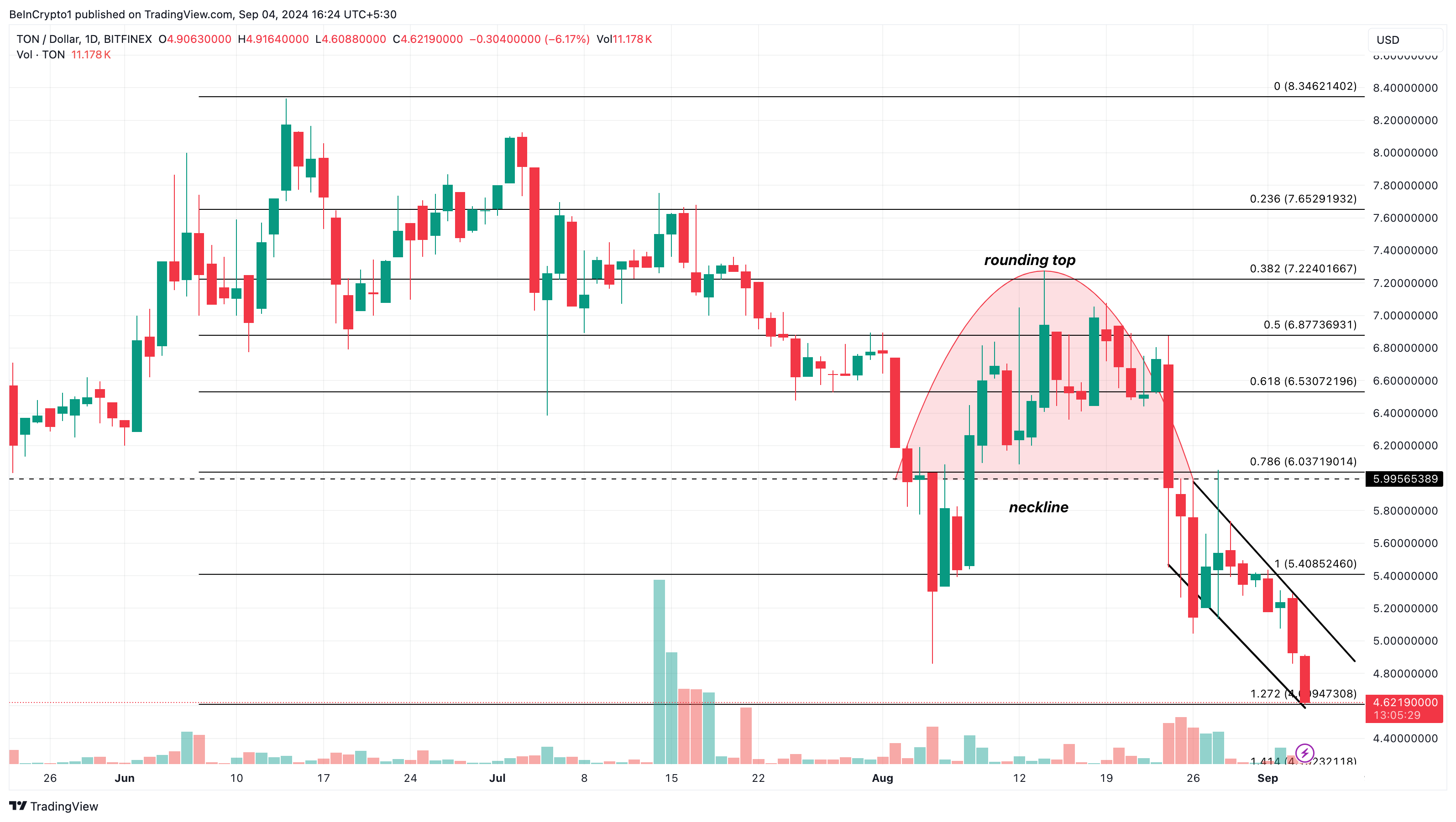Bovendien toont de dagelijkse grafiek aan dat TON tussen 2 en 26 augustus een afrondend top patroon heeft gevormd. Dit patroon wordt doorgaans als bearish beschouwd en signaleert een mogelijke omkering van de voorgaande uptrend.