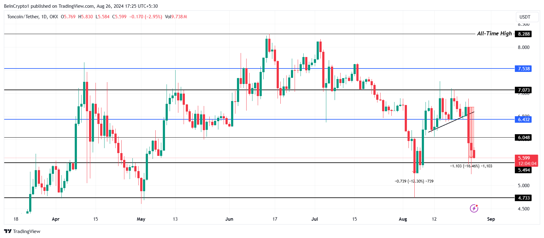 De koers van Toncoin daalde in drie dagen met bijna 16,5% naar $5,59 op het moment van schrijven. De daling resulteerde in het verlies van de uptrend en de steun van de uptrendlijn.