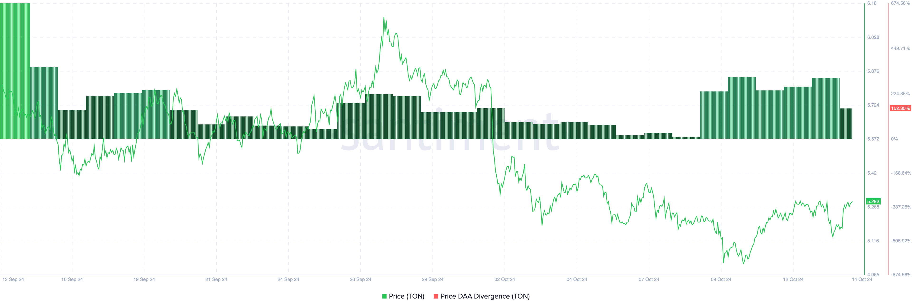 De dagelijkse actieve adressen (DAA) divergentie van Toncoin ondersteunt dit perspectief. Typisch, een daling in DAA divergentie duidt op afnemende gebruikersbetrokkenheid en dient vaak als een verkoopsignaal. Echter, op dit moment is de metriek gestegen, wat suggereert dat toenemende activiteit op het netwerk van Toncoin zijn potentiële koersgroei zou kunnen ondersteunen.
