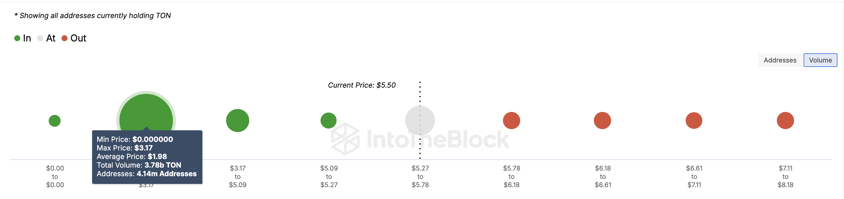 De GIOM helpt bij het identificeren van steun- en weerstandsniveaus door het volume van tokens op winst-, verlies- of break-evenpunten te tonen. Grotere clusters op specifieke prijsniveaus duiden op sterkere steun of weerstand. Opvallend is dat meer dan 30 miljoen adressen 222 miljoen TON-tokens bezitten die met verlies zijn gekocht, tussen $5,78 en $8,18.