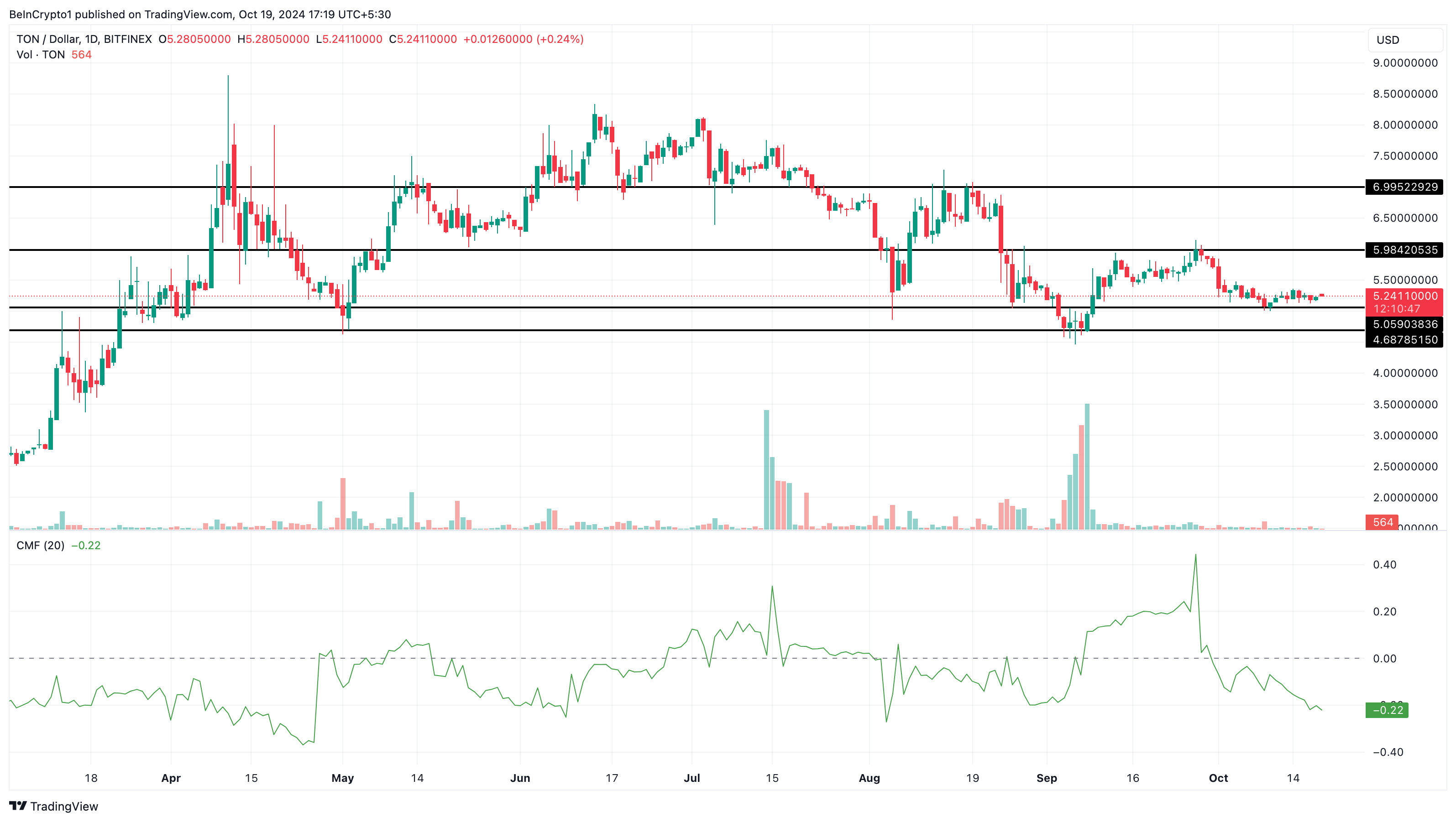 Zoals hieronder te zien is, is de CMF gedaald naar -0,22, wat suggereert dat Toncoin te maken heeft met een hoge mate van verkoopdruk. Mocht dit doorgaan, dan kan de koers van TON dalen onder de $5,05 steun en $4,69 bereiken.