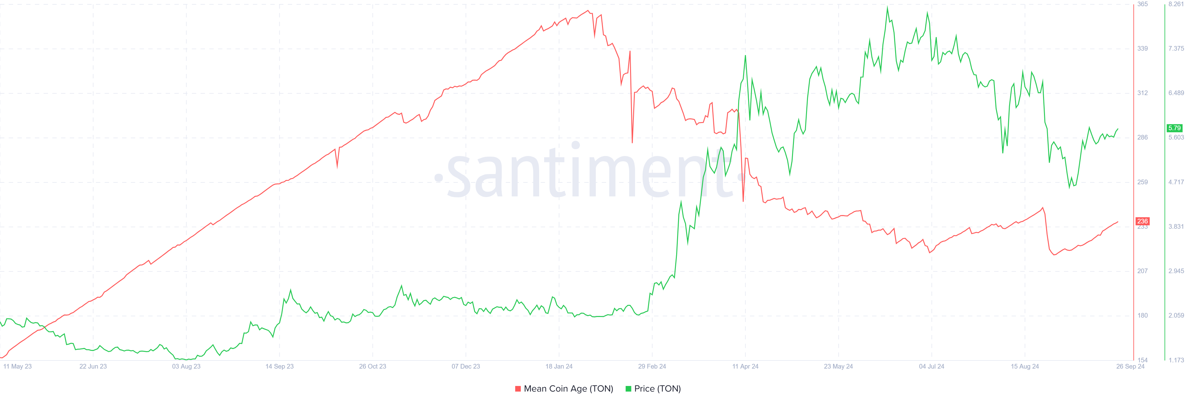 Lange termijn houders van Toncoin hebben sterke vertrouwen getoond door hun bezittingen vast te houden zonder veel beweging in de afgelopen maand. Dit wordt verder bevestigd door een toename in de Mean Coin Age (MCA), een maatstaf voor hoe lang coins in dezelfde wallet zitten. Een stijging in de MCA weerspiegelt over het algemeen toegenomen vertrouwen onder houders, aangezien ze ervoor kiezen niet te verkopen, zelfs te midden van marktfluctuaties.