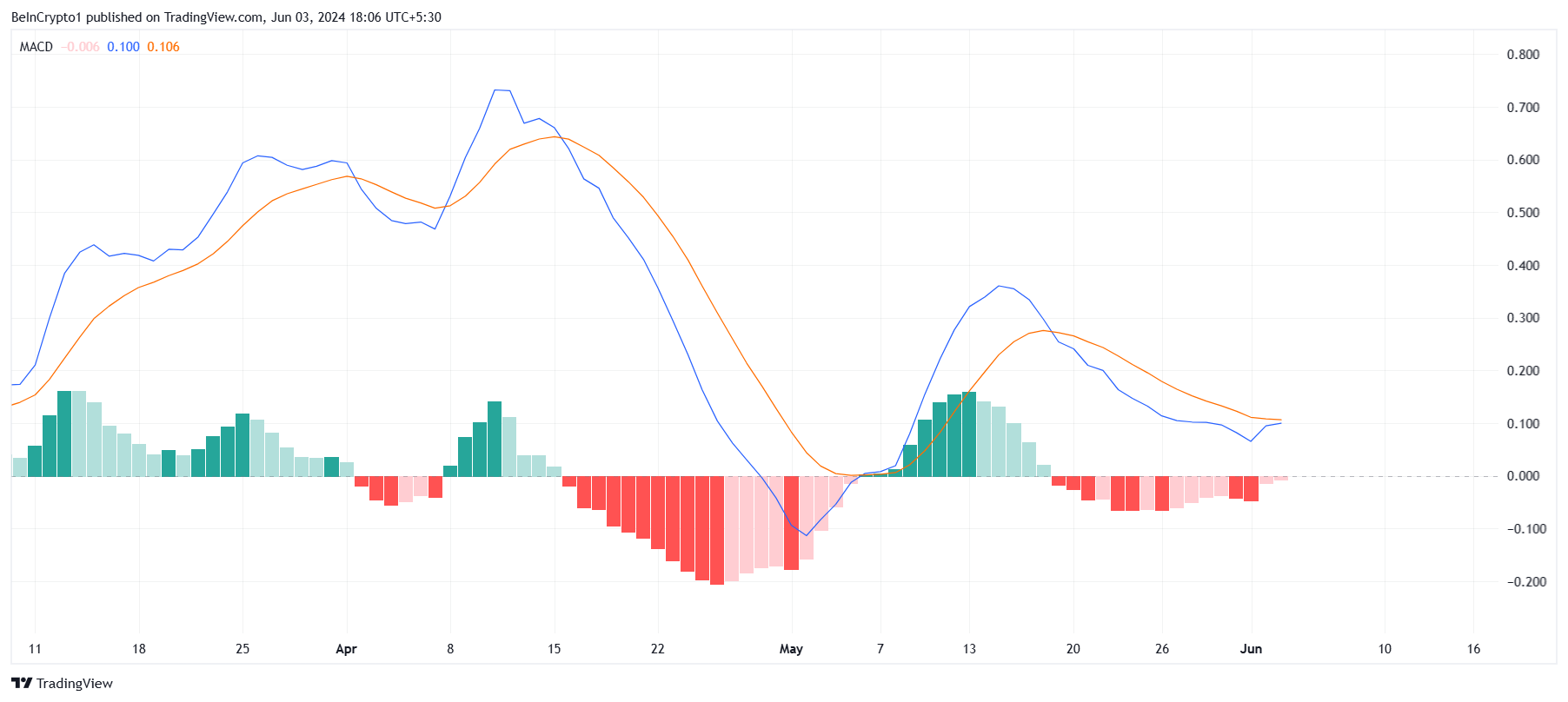 De markt staat positief tegenover een stijging, met Moving Average Convergence Divergence (MACD) die in dezelfde richting wijst. De MACD is een trendvolgende momentum indicator die de relatie laat zien tussen twee moving averages van de koers van een asset en helpt bij het identificeren van potentiële koop- en verkoopsignalen.