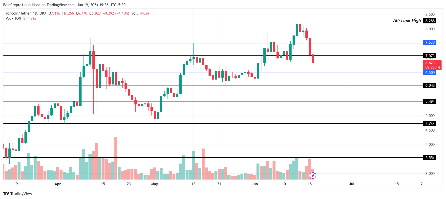 De Toncoin koers wordt verhandeld op $6,8, een daling ten opzichte van de ATH van $8,2. De 16% daling van de afgelopen vier dagen resulteerde in een val van TON door meerdere steunniveaus van $7,5 en $7,0, en komt nu dicht in de buurt van $6,5.