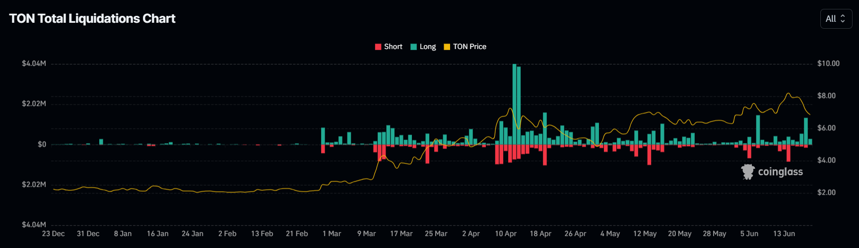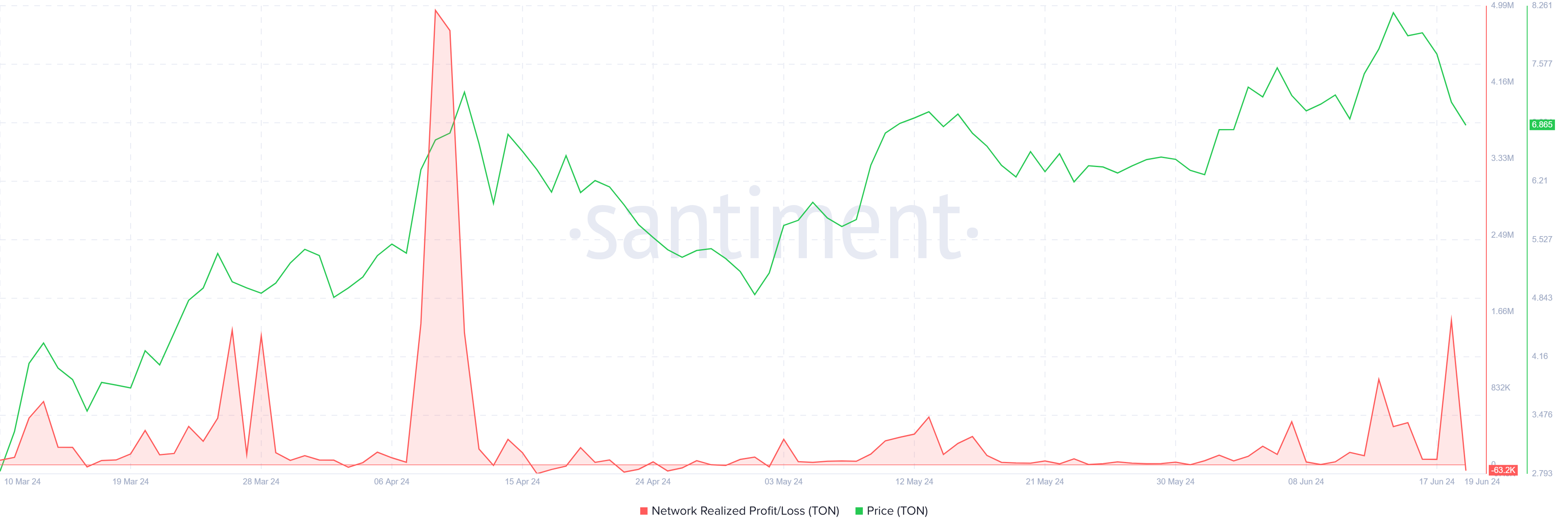 De Toncoin koers bereikte onlangs een nieuwe all-time high op $8,2 nadat de markt consistent bullishness toonde ten opzichte van Telegram Coins. De investeerders HODLden tot deze mijlpaal, maar hebben zich sindsdien sterk gericht op het veiligstellen van hun winsten.