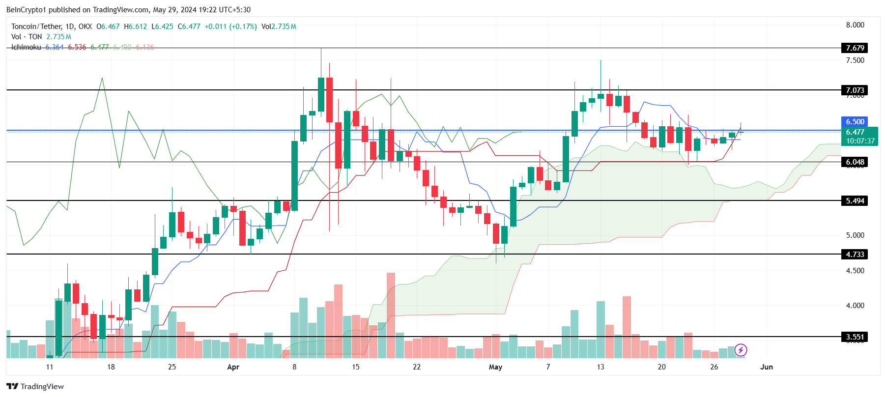 De laatste keer dat de Toncoin koers door de $6,5 barrière brak, steeg het naar $7. Hoewel TON er niet boven kon sluiten, toonde dit aan dat $6,5 de kritieke weerstand en steun voor de cryptomunt is.