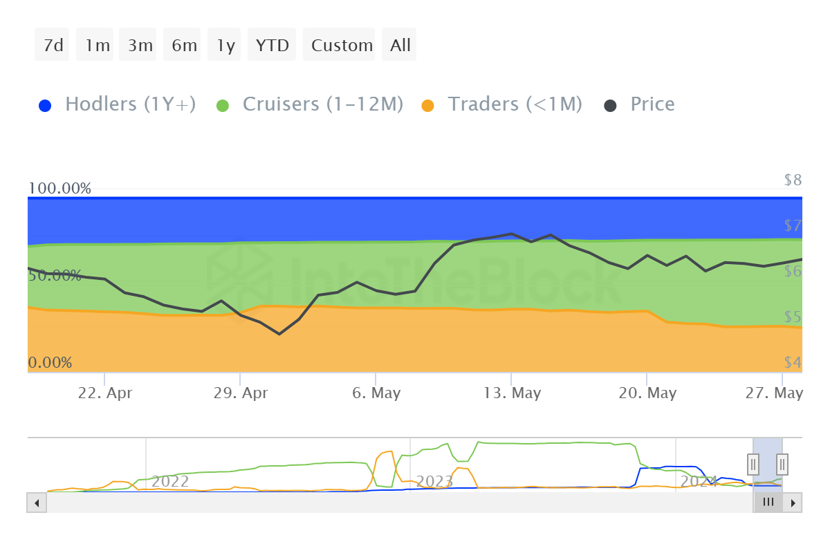 Als gevolg hiervan wordt de dominantie van korte-termijn houders in het aanbod beschouwd als een bearish teken, omdat ze meer geneigd zijn om te verkopen. Ongeveer 7% van de totale circulerende TON-voorraad is nu echter verschoven naar de middellange-termijn holders.