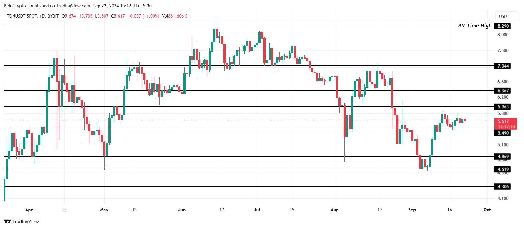 De koers van Toncoin (TON) heeft recentelijk relatieve stabiliteit getoond, waarbij het stevig boven het steunniveau van $5,49 bleef. Echter, voor echt herstel en significante groei, moet TON de weerstand van $5,96 omzetten in steun.