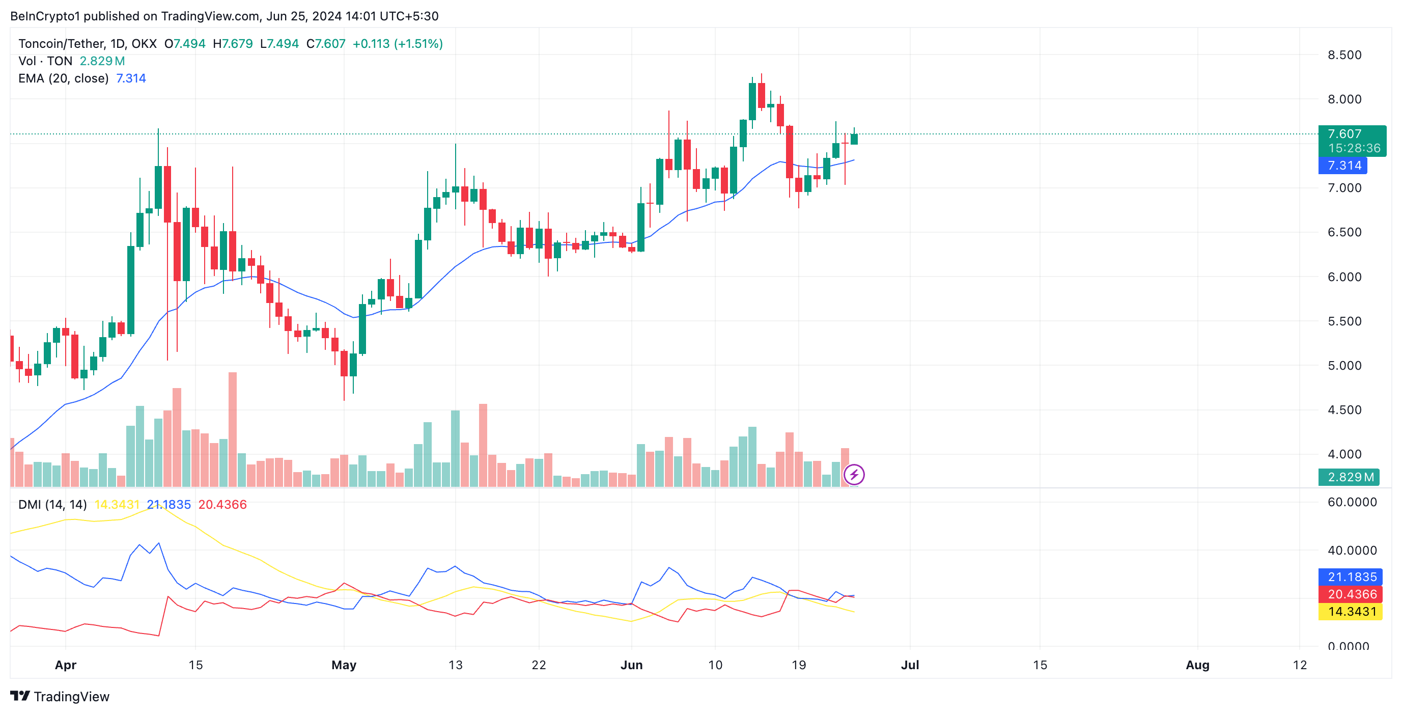 Op het moment van schrijven noteert TON $7,57. Een beoordeling van de koers op een dagelijkse grafiek laat zien dat de koers onlangs de 20-daagse Exponential Moving Average (EMA) passeerde.