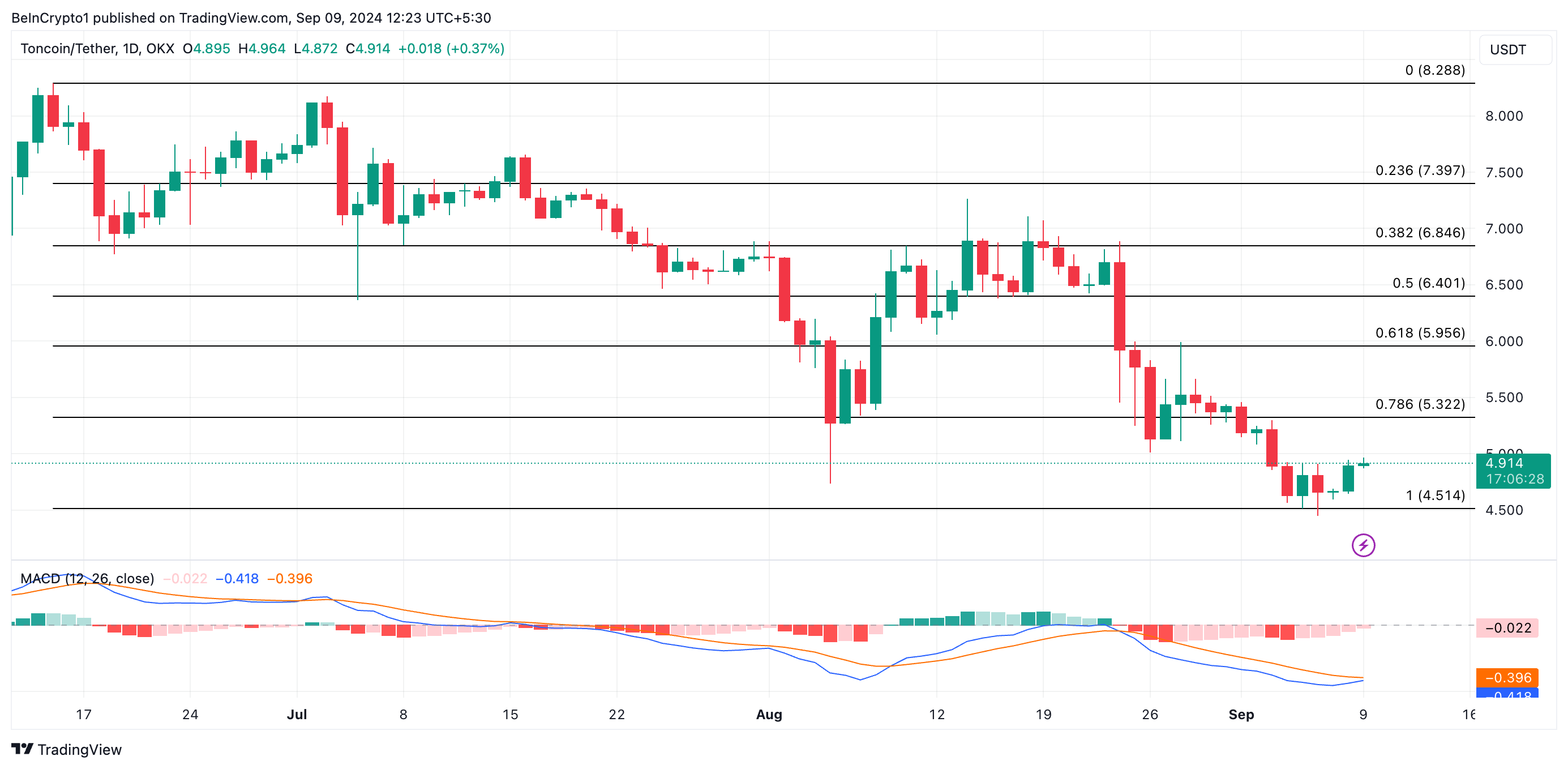 Echter, als winstnemingen toenemen, kunnen deze bullish verwachtingen ongeldig worden. Verhoogde verkoopdruk kan de Toncoin koers naar $4,51 drukken.
