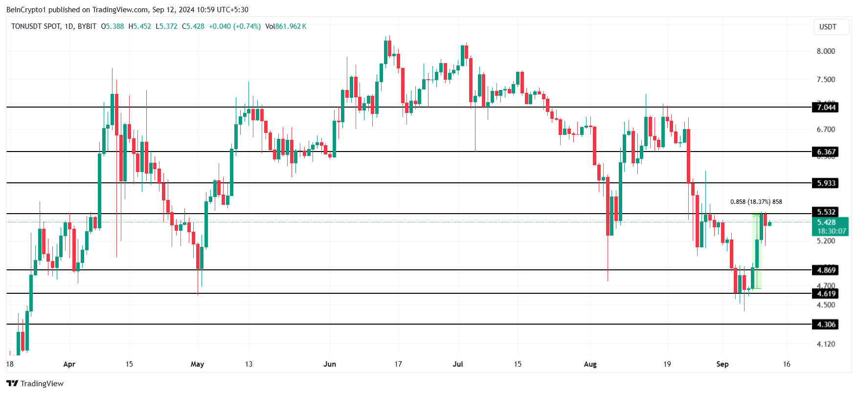 Tot slot heeft de recente stijging van 18% van Toncoin naar $5,42 binnen drie dagen het dicht bij het doorbreken van een belangrijk weerstandsniveau op $5,53 gebracht. Een doorbraak boven deze weerstand zou kunnen wijzen op nog grotere winsten op korte termijn.