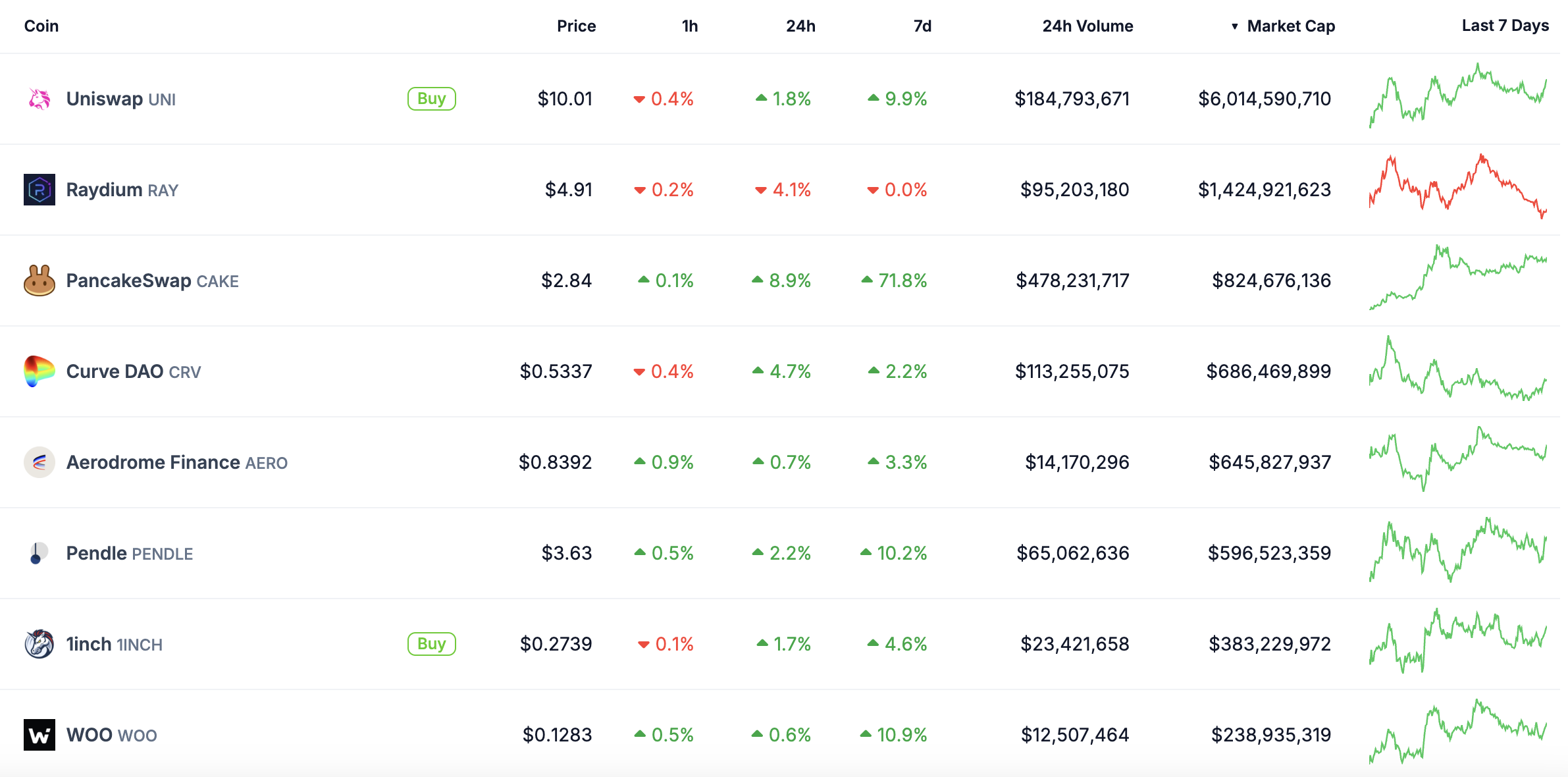 UNI, CAKE, PENDLE en WOO zijn allemaal gestegen in de afgelopen week, waardoor het een van de heetste crypto-narratives van dit moment is. De lancering van Uniswap’s Unichain versterkt zijn ecosysteem, terwijl het momentum van BNB CAKE’s stijging van 70% heeft aangewakkerd.