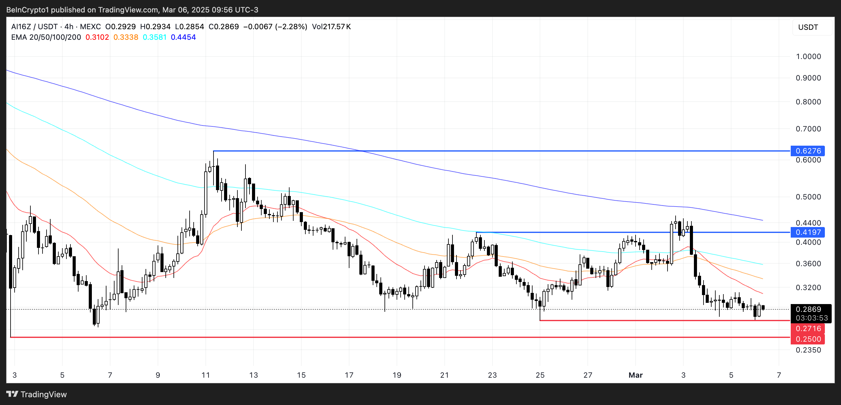 Aan de andere kant, als de correctie doorgaat, zou de koers kunnen dalen om de steun rond $0,25 te testen, en een doorbraak onder dat niveau zou AI16Z naar zijn laagste koers sinds november 2024 duwen.