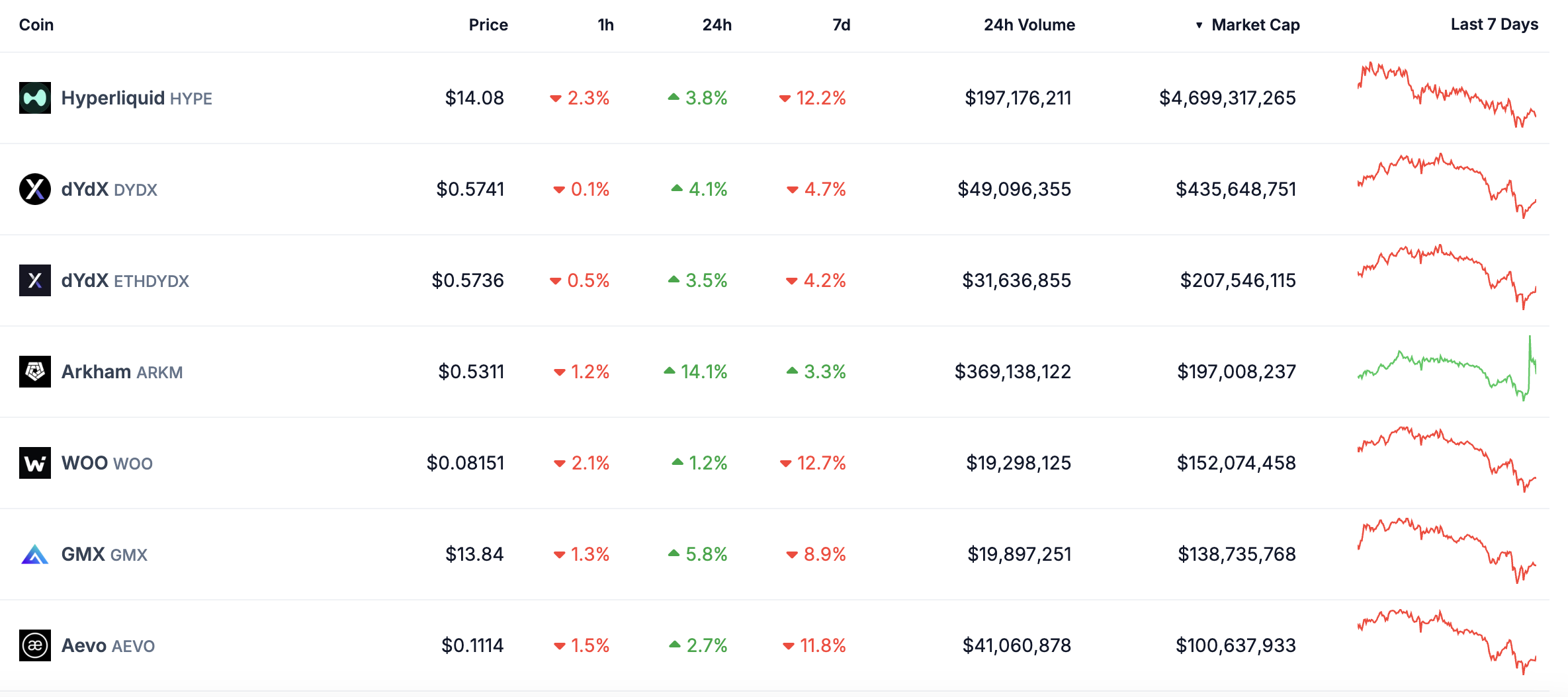 Deze mate van dominantie suggereert echter ook dat er ruimte is voor concurrenten om op te komen en zijn positie uit te dagen. Arkham is bijvoorbeeld met 14% gestegen in de afgelopen 24 uur. Dit geeft aan dat sommige handelaren inzetten op alternatieve projecten binnen het perpetuals ecosysteem.